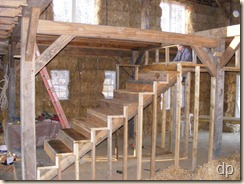 After lunch I worked for a couple of more hours and was able to cut and install the treads. I used 2x12s. I did have to rip about 1/4 of an inch off of each of them so that they would be the right width. One of the treads had to be notched to fit around the post at the bottom of the stairs. I cut the lines with my circular saw, finishing them with a hand saw.